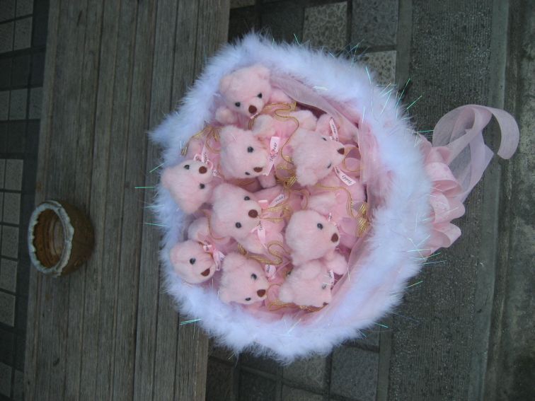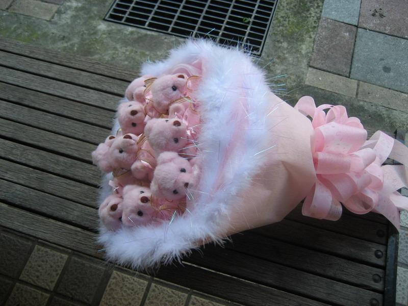 簡簡單單的美.以羽毛.精美的包裝紙透過設計師的巧手.將9隻可愛的小熊包裝成一束精美又能典藏久久的小熊花束.是所有小女生人見人愛的花禮